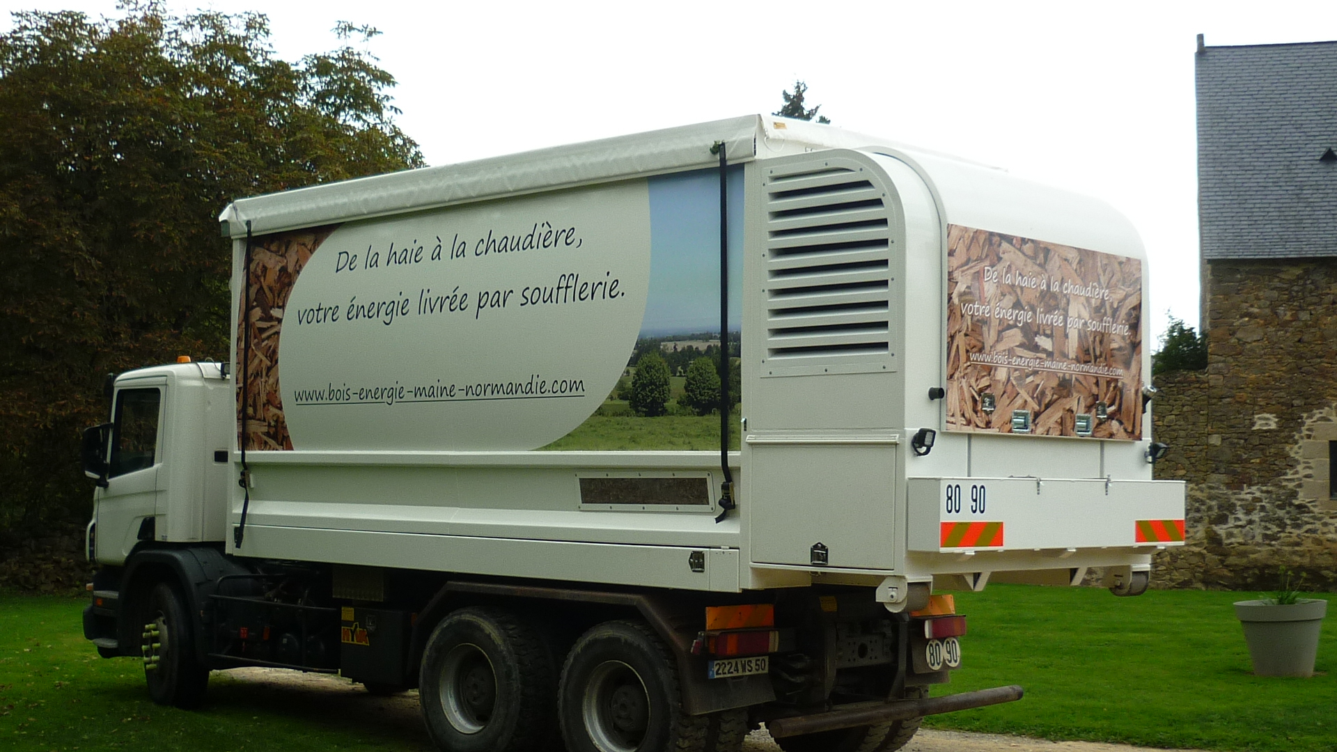 Livraison par benne agricole d’une chaufferie collective de l’un de nos clients.