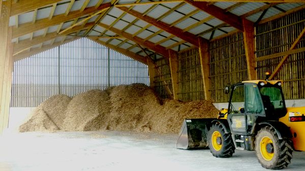 Cette étape consiste à entreposer les plaquettes bois à l’abri sous un hangar avec ventilation naturelle (bardage à claire-voie, faîtière ventilée). Le bois est disposé jusqu’à 6-7 m de hauteur et sèche naturellement par la chaleur dégagée par le tas. Le combustible bois passe d’un taux d’humidité de 40 à 55 % à un taux inférieur à 30 %.